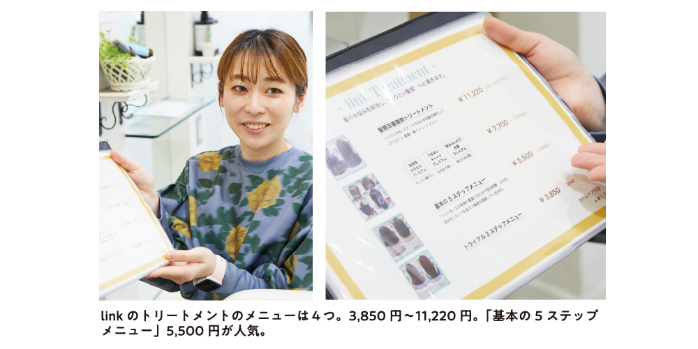 この美容室がこのところ勧めているのは、link(リンク)を使用したヘアトリートメント・メニュー。トリートメントを加えることで、客単価が平均7,000円台から1万円以上にアップしました。