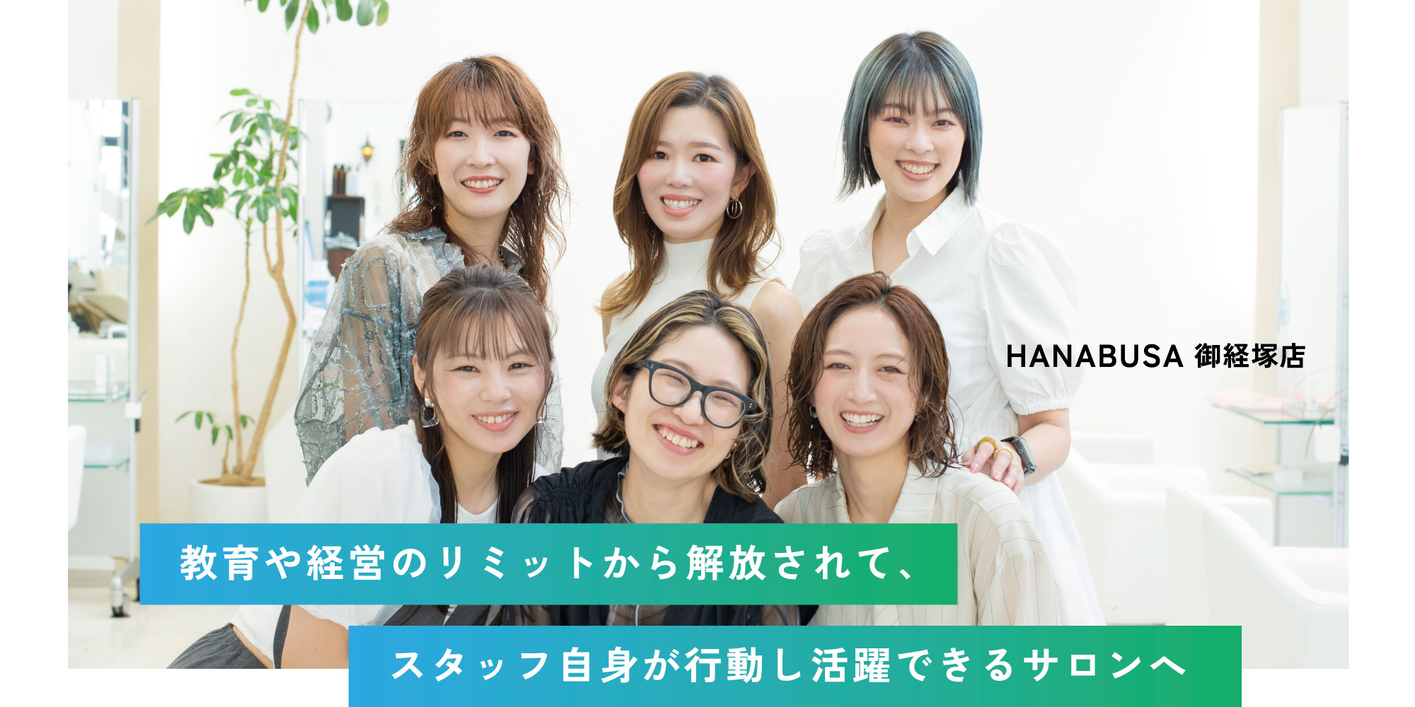 美容室のほか、ネイルサロンや頭皮ケア専門店など計6店舗を展開し、お客さまに最先端の美を届けるための設備やメニューが高い評価を得ているHANABUSA。組織としては女性幹部の多さが特徴です。美容師をしながら経理やマーケティング、教育、クリエイティブなどに兼務で携われる体制を整備してきました。「一般的に、多くの優れた女性美容師がキャリアの壁に直面し、経営側も結婚や出産・育児・体調の変化をリスクと捉えているのを見てきました。私たちはマルチタスクが得意など女性の強みを活かして、人生の奥行きと幅を広げ活躍できる場を作っています」(山本さん)